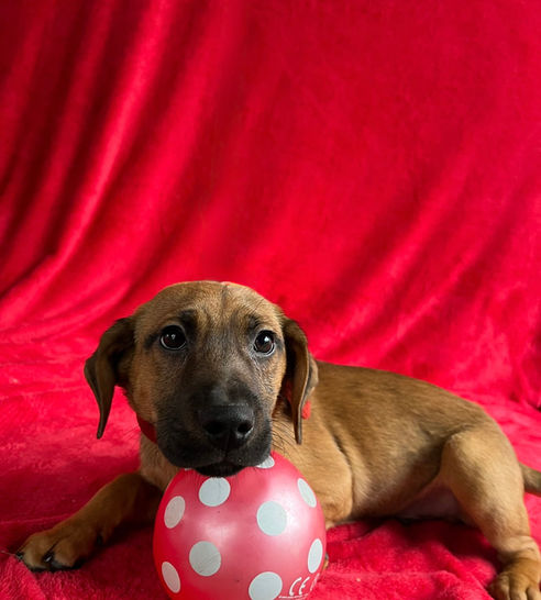 Chili ist der kleine Wirbelwind der Gruppe. Er startet jedes Spiel und jeden Unfug, ist immer mittendrin statt nur dabei und kaut begeistert alles an, was ihm in die Quere kommt. Besonders liebt er Ballspiele und kann sich dafür kaum bremsen. Gleichzeitig achtet Chili sehr auf den Menschen, sucht aktiv den Kontakt und genießt Aufmerksamkeit und Nähe. Er ist fröhlich, lebhaft und voller Energie – ein typischer Welpe mit großem Herz. Seine Endgröße wird auf ca. 45-50 cm geschätzt.