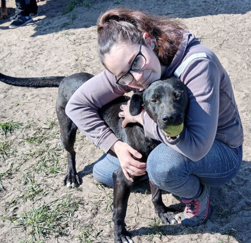Beim Mentorprogramm, zu dem sie von Freiwilligen regelmäßig auf den sicheren Spielplatz geholt wird, zeigt sie sich besonders von der besten Seite. Sie begrüßt unbekannte Menschen offen, glücklich, direkt, bindungsorientiert, genießt Körperkontakt, verschenkt Küsschen, fordert Zuwendung ein, indem sie sich einfach dazu setzt, anlehnt oder ein Bein umarmt, wenn sie Halt sucht. Sie ist kinderlieb, sozial im Umgang mit Menschen und im Kontakt mit ihren Zwinger-Mitbewohnern eher unterwürfig und vorsichtig, dabei aber friedlich. Hundeinteraktionen gelingen ihr auf neutralem Raum unter Aufsicht gut – sie versteht sich mit Artgenossen, auch wenn sie hier und da noch etwas Orientierung braucht. Bälle findet sie großartig, das Spiel liebt sie, das Ende gemeinsamer Zeit fällt ihr schwer, nicht weil sie klammert, sondern weil sie bindet.